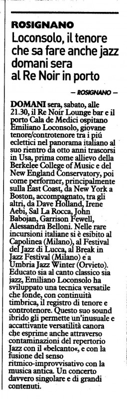 ROSIGNANO, domani sera, sabato, alle 21:30, il Re Noir Lounge Bar e il porto Cala de Medici ospitano Emiliano Loconsolo, giovane tenore/controtenore tra i piu’ eclettici nel panorama italiano al suo rientro da otto anni trascorsi in USA, prima come allievo del Berklee College of Music e del New England Conservatory, poi come performer, principalmente sulla east coast, da New York a Boston, accompagnato tra gli altri, da Dave Holland, Irene Aebi, Sal La Rocca, John Babojan, Garrison Fewell, Alessandra Belloni. Nelle rare incursioni Italiane si e’ esibito al Capolinea (Milano), al Festival del Jazz di Lucca, al Break in Jazz Festival (Milano) e a Umbria Jazz Winter (Orvieto).
