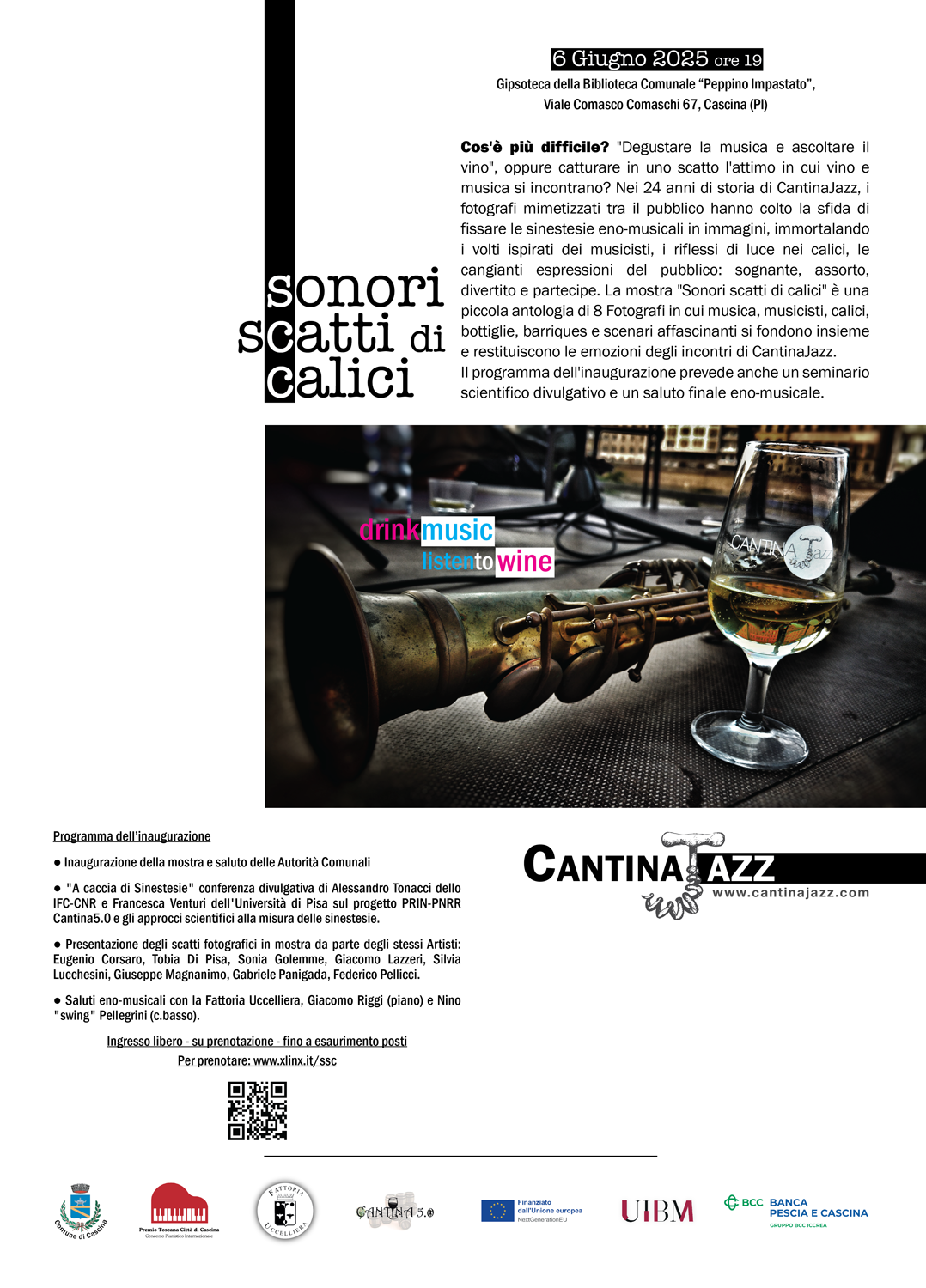 While I couldn’t be there in person — currently based in Berlin — I’m truly honored to have been featured in the beautiful new exhibition of CantinaJazz “Sonori Scatti di Calici”, inaugurated on June 6th, 2025 at the Gipsoteca della Biblioteca Comunale “Peppino Impastato” in Cascina (PI).