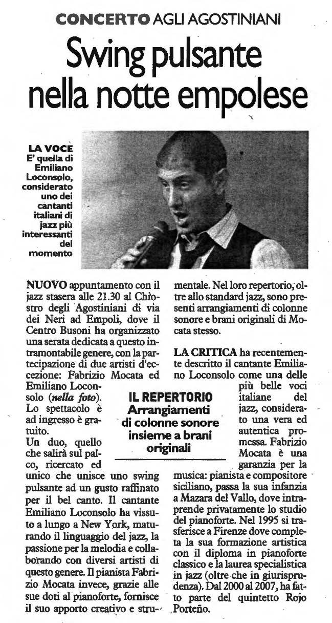 La critica ha recentemente descritto il cantante Emiliano Loconsolo come una delle piu’ belle voci italiane del jazz, considerato una vera ed autentica promessa. Fabrizio Mocata e’ una garanzia per la musica; pianista e compositore siciliano, passa la sua infanzia a Mazara del Vallo, dove intraprende privatamente lo studio del pianoforte. Nel 1995 si trasferisce a Firenze dove completa la sua formazione artistica con il diploma in pianoforte classico e la laurea specialistica in jazz (oltre che in giurisprudenza). Dal 2000 al 2007 ha fatto parte del quintetto Rojo Porteno.